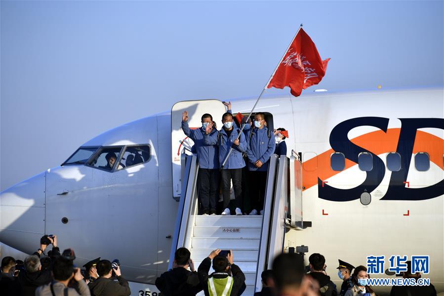 3月17日,醫(yī)療隊隊員抵達(dá)山東濟(jì)南遙墻國際機(jī)場。新華社發(fā)(饒琦攝)