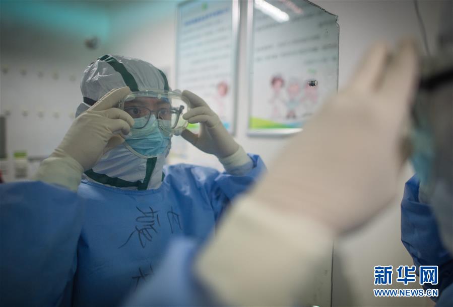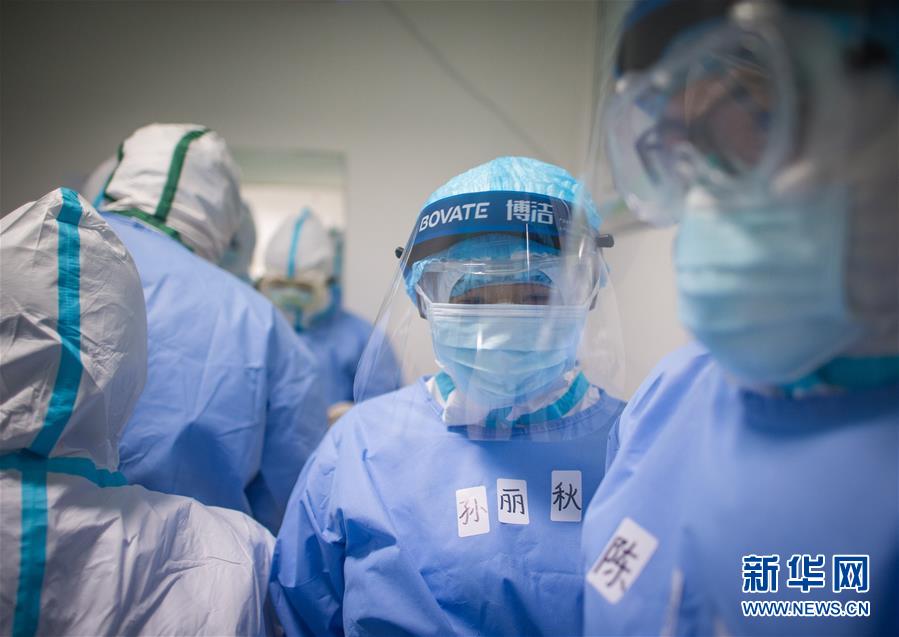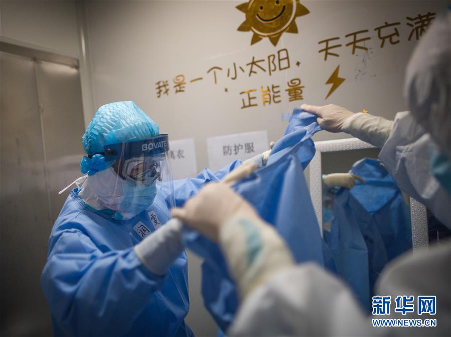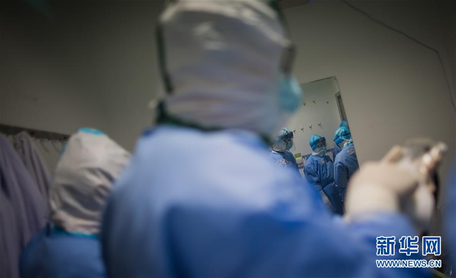 3月19日,在武漢市肺科醫(yī)院隔離病房,海南醫(yī)療隊隊員詹才露在現(xiàn)場忙碌。 新華社記者 肖藝九 攝
