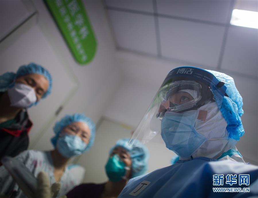 3月19日,在武漢市肺科醫(yī)院隔離病房,海南醫(yī)療隊隊員在現(xiàn)場忙碌。 新華社記者 肖藝九 攝