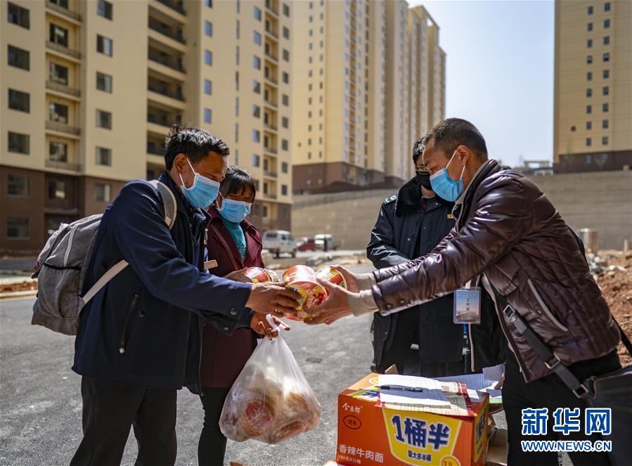 云南省永善縣大興鎮(zhèn)駱丘村村民晏付高(左一)和妻子王大香(左二)抵達魯?shù)榭h卯家灣,當?shù)卣疄槊恳粦舻诌_的老百姓都準備了當日所需的生活用品(3月15日攝)。 新華社記者 江文耀 攝