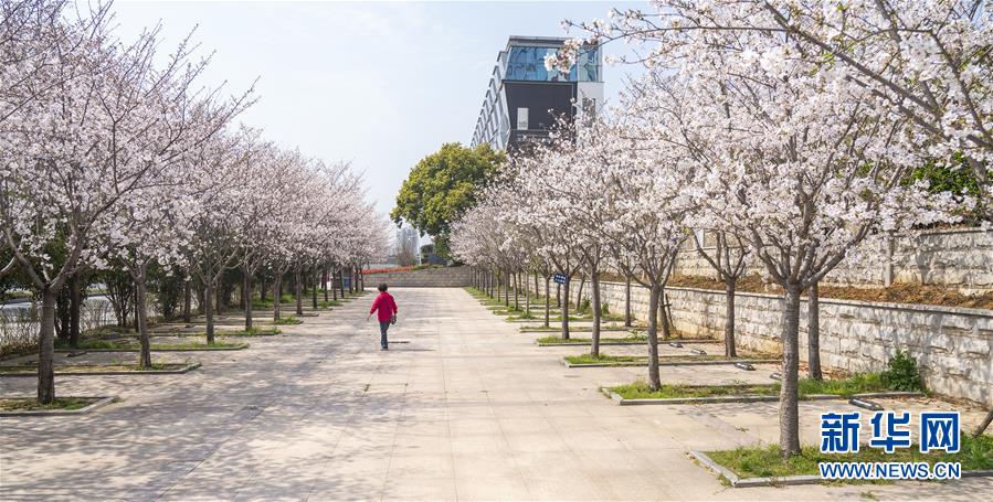 3月19日,在武漢市武昌區(qū)被網(wǎng)友稱為“武漢最美停車場”的湖北日報停車場,一名工作人員從櫻花樹邊經(jīng)過。 新華社記者 才揚(yáng) 攝