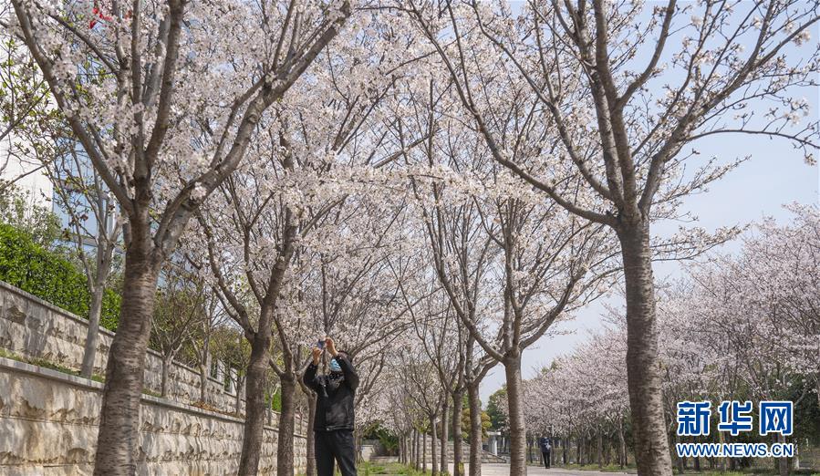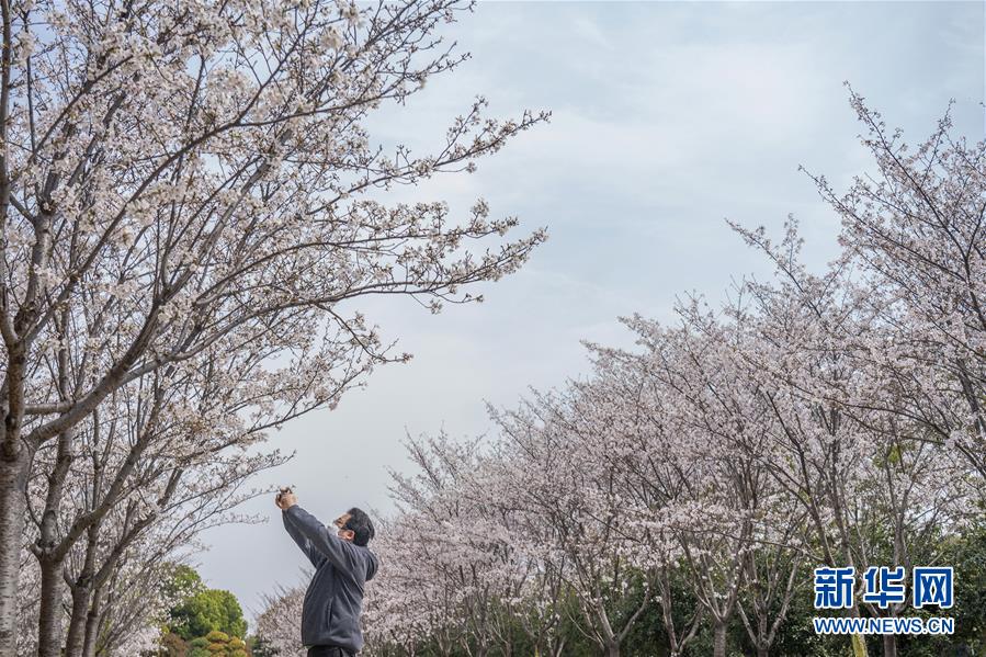 3月19日,在武漢市武昌區(qū)被網(wǎng)友稱為“武漢最美停車場”的湖北日?qǐng)?bào)停車場,一名工作人員在拍攝櫻花。 新華社記者 才揚(yáng) 攝