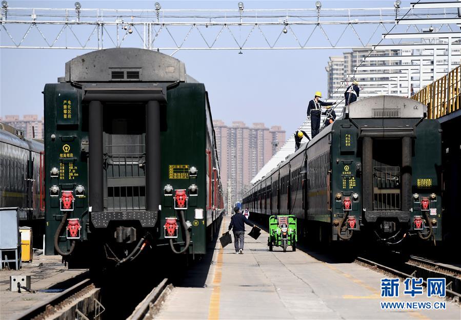 3月19日,鄭州車輛段客車檢車員在對(duì)客車空調(diào)機(jī)組進(jìn)行檢修作業(yè)。新華社記者 李安 攝