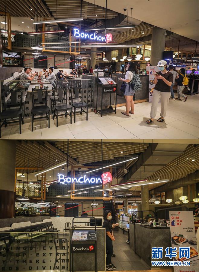 這是3月21日拍攝的泰國曼谷暹羅百麗宮商場(chǎng)負(fù)一層的美食城(上圖)和3月22日拍攝的美食城對(duì)比圖。商場(chǎng)除了負(fù)一層的美食城和超市外,全部關(guān)閉。美食城只對(duì)顧客提供外賣服務(wù)。新華社記者張可任攝
