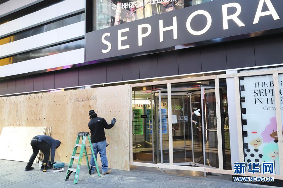 3月21日,在美國紐約時(shí)報(bào)廣場,工人用木板封閉一家化妝品店。美國紐約州、伊利諾伊州、康涅狄格州20日發(fā)布針對本州居民的“居家令”,以遏制新冠病毒傳播。這些“居家令”涵蓋紐約、洛杉磯、芝加哥等大城市,影響數(shù)千萬人。白宮20日發(fā)表聲明說,總統(tǒng)特朗普已宣布紐約州出現(xiàn)“重大災(zāi)難”,命令聯(lián)邦政府支援該州抗擊新冠肺炎疫情。新華社記者王迎攝