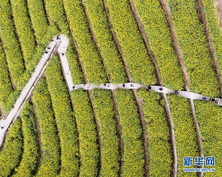 2019年2月5日,春節(jié)期間,廣西來賓市忻城縣萬余畝油菜花競相綻放,吸引眾多游客前來賞花游玩,感受春天的氣息。近年來,廣西忻城縣大力實施鄉(xiāng)村振興戰(zhàn)略,注重發(fā)展鄉(xiāng)村旅游產(chǎn)業(yè),把鄉(xiāng)村旅游與美麗鄉(xiāng)村、脫貧攻堅緊密結(jié)合起來,輻射帶動當(dāng)?shù)刎毨裘撠氈赂?。樊紹光/視覺中國