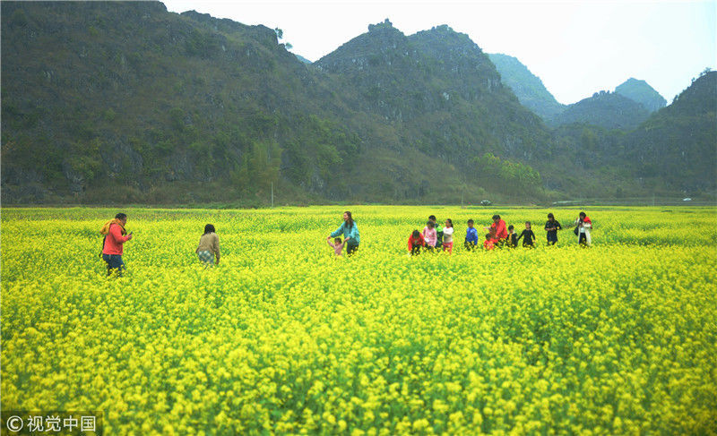 2019年2月5日,廣西來賓,當(dāng)天是農(nóng)歷大年初一,人們在忻城縣城關(guān)鎮(zhèn)隆光村油菜花海中賞花游玩。