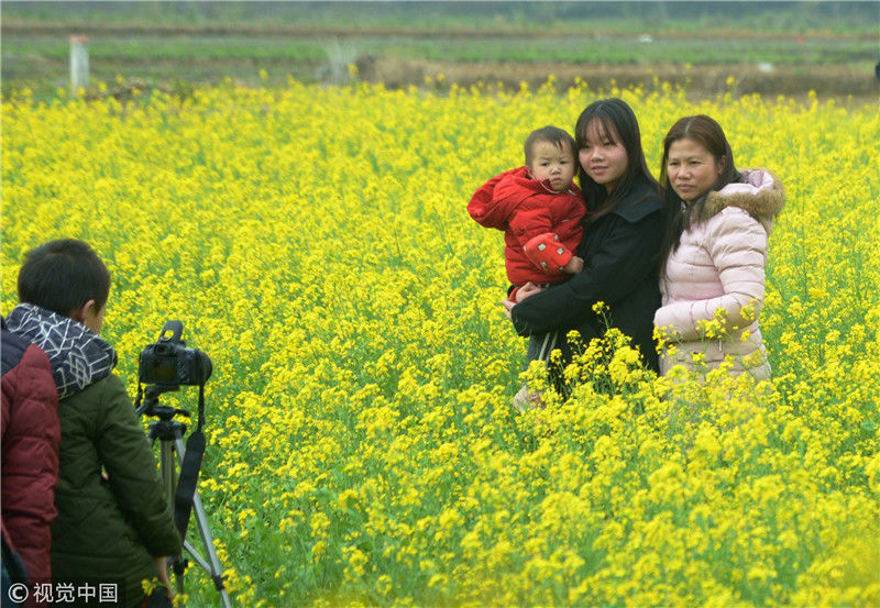 2019年2月5日,廣西來賓,當(dāng)天是農(nóng)歷大年初一,人們在忻城縣城關(guān)鎮(zhèn)隆光村油菜花海中賞花游玩。