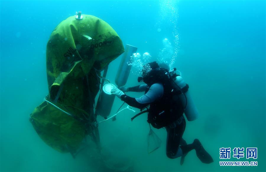 在位于海南三亞蜈支洲島旅游區(qū)的海洋牧場(chǎng),工作人員在為浮力袋充氣后,浮力袋帶著固定好的人工魚礁上浮(3月27日攝)。近日,位于海南三亞蜈支洲島旅游區(qū)的海洋牧場(chǎng)復(fù)工,海底作業(yè)逐漸恢復(fù)正常,開始進(jìn)行人工魚礁吊裝擺位、水下監(jiān)控清理以及日常巡護(hù)等工作。據(jù)介紹,人工魚礁有利于魚類種類增加和數(shù)量提高,蜈支洲島海域海洋牧場(chǎng)人工魚礁表面附著珊瑚、貝類、藻類等生物種類達(dá)120余種。新華社記者楊冠宇攝