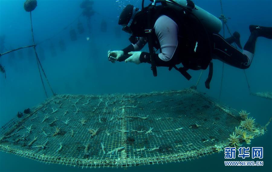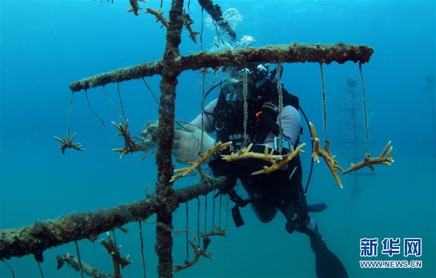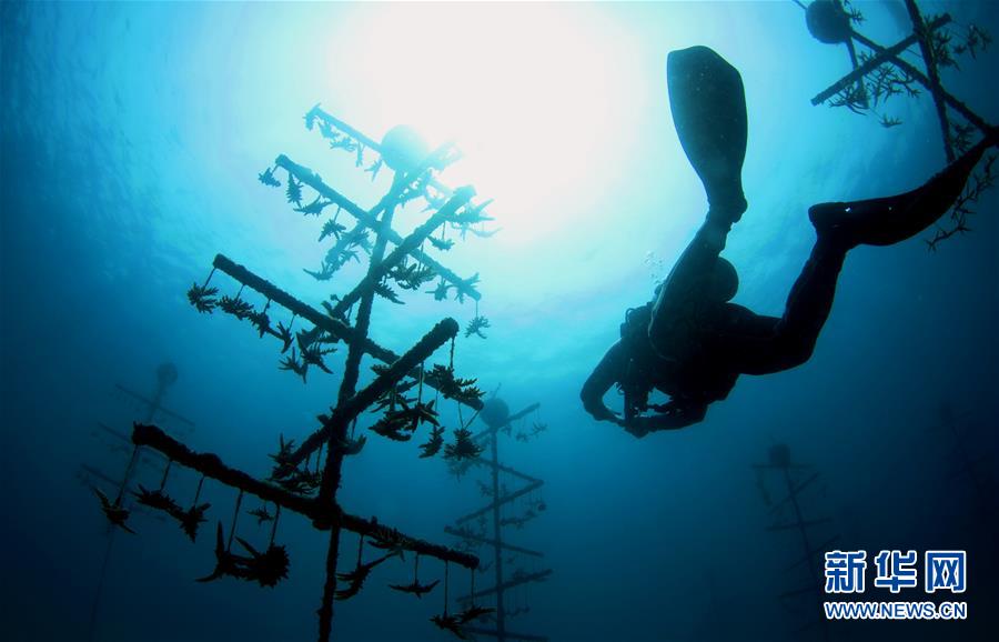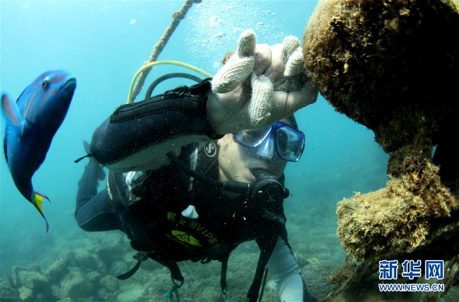 3月28日,在位于海南三亞蜈支洲島旅游區(qū)的海洋牧場(chǎng),工作人員在清理附著在珊瑚上的漁網(wǎng)。近日,位于海南三亞蜈支洲島旅游區(qū)的海洋牧場(chǎng)復(fù)工,海底作業(yè)逐漸恢復(fù)正常,開始進(jìn)行人工魚礁吊裝擺位、水下監(jiān)控清理以及日常巡護(hù)等工作。據(jù)介紹,人工魚礁有利于魚類種類增加和數(shù)量提高,蜈支洲島海域海洋牧場(chǎng)人工魚礁表面附著珊瑚、貝類、藻類等生物種類達(dá)120余種。新華社記者楊冠宇攝