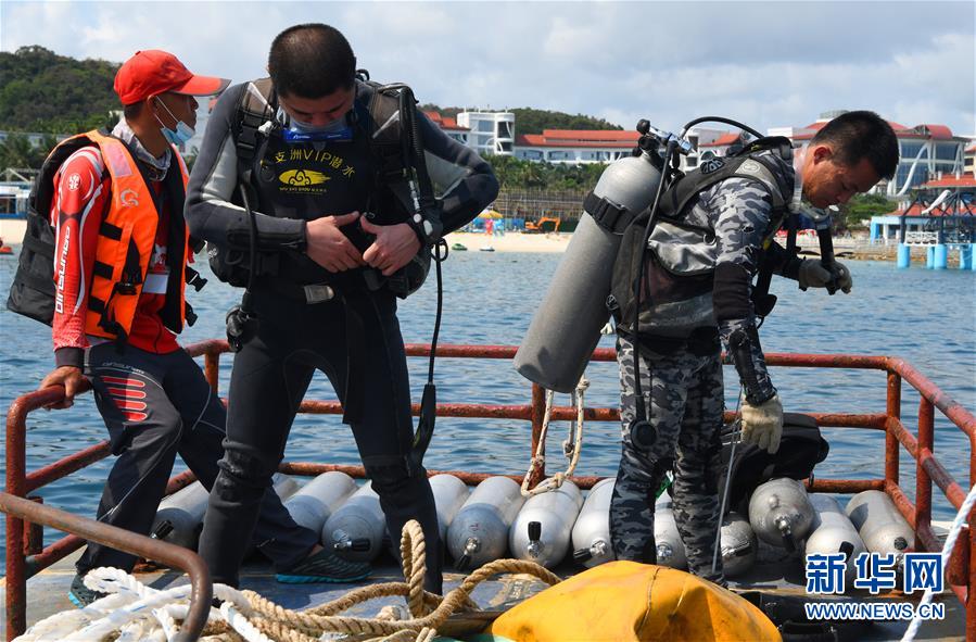 在位于海南三亞蜈支洲島旅游區(qū)的海洋牧場(chǎng),工作人員在船上穿戴裝備,準(zhǔn)備下海作業(yè)(3月27日攝)。近日,位于海南三亞蜈支洲島旅游區(qū)的海洋牧場(chǎng)復(fù)工,海底作業(yè)逐漸恢復(fù)正常,開始進(jìn)行人工魚礁吊裝擺位、水下監(jiān)控清理以及日常巡護(hù)等工作。據(jù)介紹,人工魚礁有利于魚類種類增加和數(shù)量提高,蜈支洲島海域海洋牧場(chǎng)人工魚礁表面附著珊瑚、貝類、藻類等生物種類達(dá)120余種。新華社記者楊冠宇攝
