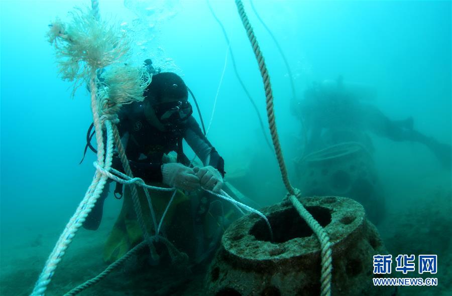3月28日,在位于海南三亞蜈支洲島旅游區(qū)的海洋牧場(chǎng),工作人員在海底用繩子綁住人工魚礁,準(zhǔn)備進(jìn)行吊裝擺位作業(yè)。近日,位于海南三亞蜈支洲島旅游區(qū)的海洋牧場(chǎng)復(fù)工,海底作業(yè)逐漸恢復(fù)正常,開始進(jìn)行人工魚礁吊裝擺位、水下監(jiān)控清理以及日常巡護(hù)等工作。據(jù)介紹,人工魚礁有利于魚類種類增加和數(shù)量提高,蜈支洲島海域海洋牧場(chǎng)人工魚礁表面附著珊瑚、貝類、藻類等生物種類達(dá)120余種。新華社記者楊冠宇攝