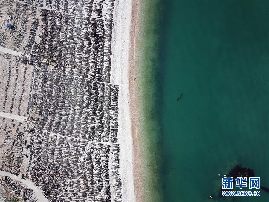 這是大欽島鄉(xiāng)東村海灘晾曬的海帶(5月23日無人機拍攝)。新華社記者朱崢攝