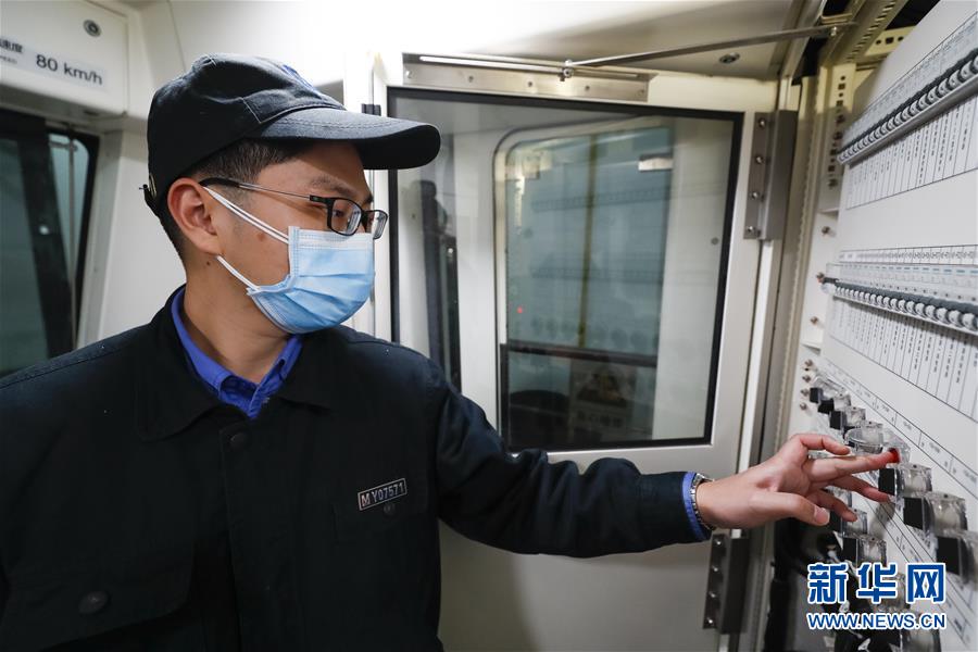 3月23日,武漢地鐵運營有限公司車輛二部檢修一車間檢修員萬交林在地鐵列車上緩解所有制動,并檢查車輛制動相關功能。新華社記者沈伯韓攝