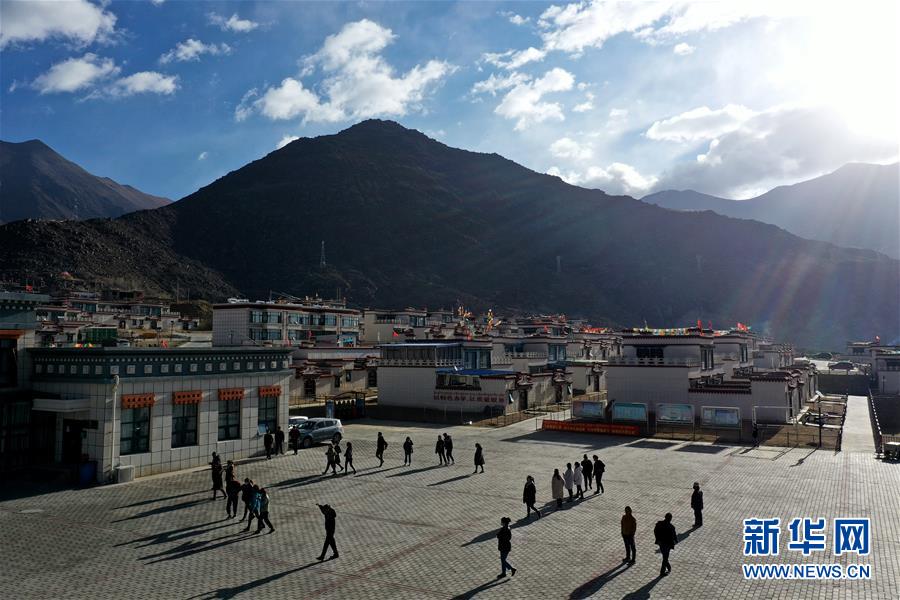 居民走在拉薩市堆龍德慶區(qū)古榮鄉(xiāng)榮瑪高海拔生態(tài)搬遷點(diǎn)廣場上(4月2日攝,無人機(jī)照片)。新華社記者 詹彥 攝