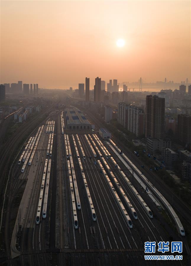 4月8日,在武漢動車段,列車停靠在存車線上準(zhǔn)備投入運行(無人機照片)。當(dāng)日,武漢市正式解除離漢離鄂通道管控措施,幾十組在武漢動車段經(jīng)過檢修消殺的動車組,猶如“陸地艦隊”停靠在存車線上,蓄勢待發(fā),重新啟程。 新華社記者 肖藝九 攝