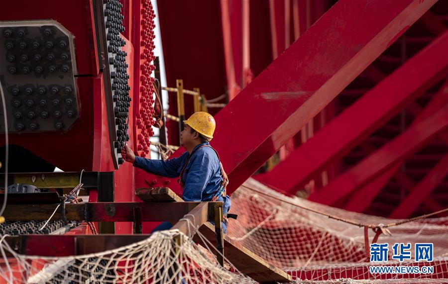 4月8日,兩名中鐵四局職工安裝架設(shè)鋼桁梁,每節(jié)鋼桁梁間的精度需要達(dá)到毫米級(jí)才能保證安裝到位。新華社記者江文耀攝