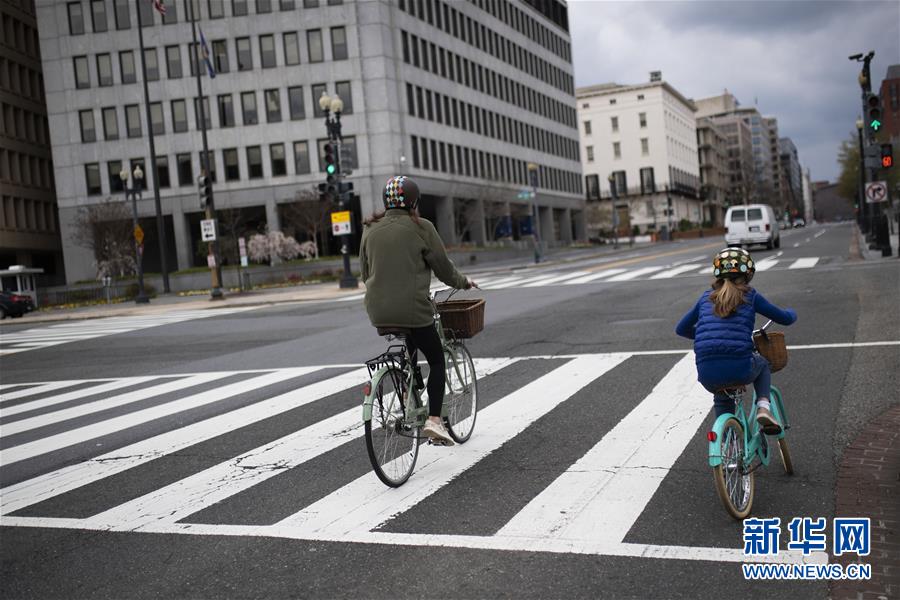4月1日,在美國(guó)首都華盛頓,兩名市民在白宮附近的一條馬路上騎車(chē)。新華社記者劉杰攝
