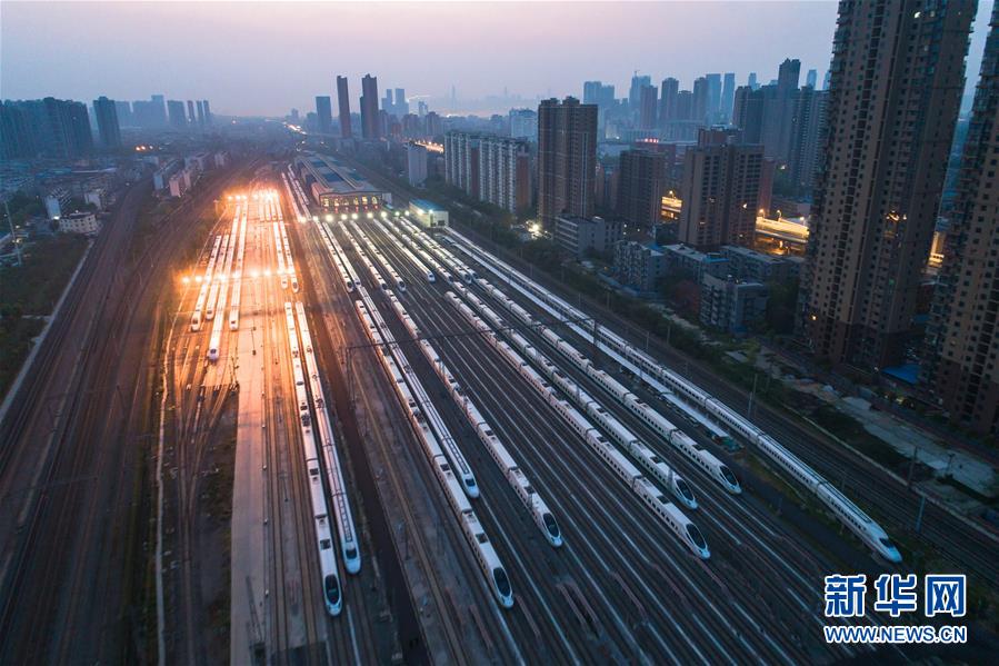 4月8日,在武漢動(dòng)車段,列車停靠在存車線上準(zhǔn)備投入運(yùn)行(無人機(jī)照片)。新華社記者肖藝九攝