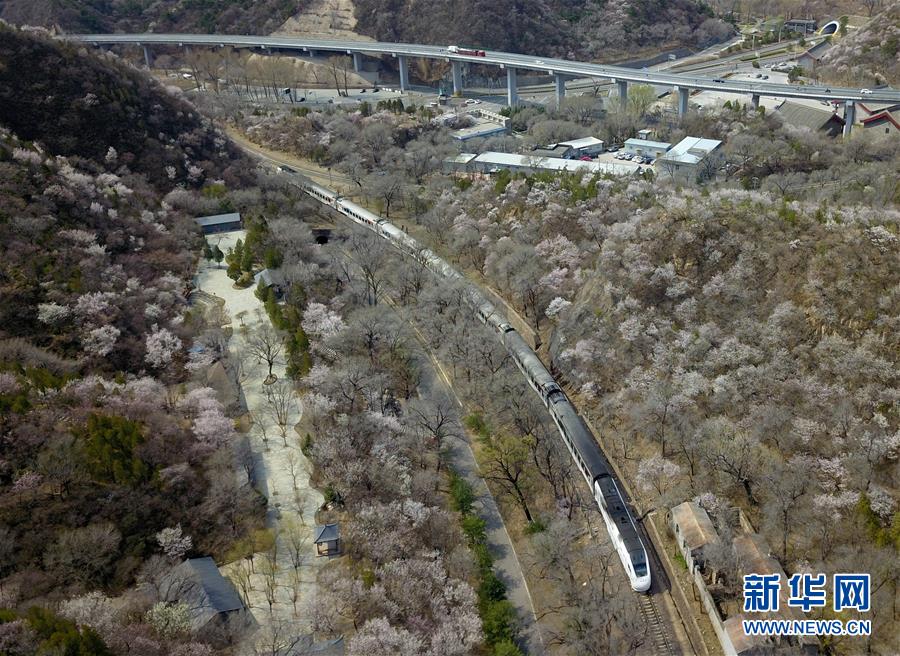 4月8日,北京青龍橋火車(chē)站附近春花盛開(kāi)(無(wú)人機(jī)照片)。 新華社記者張晨霖?cái)z