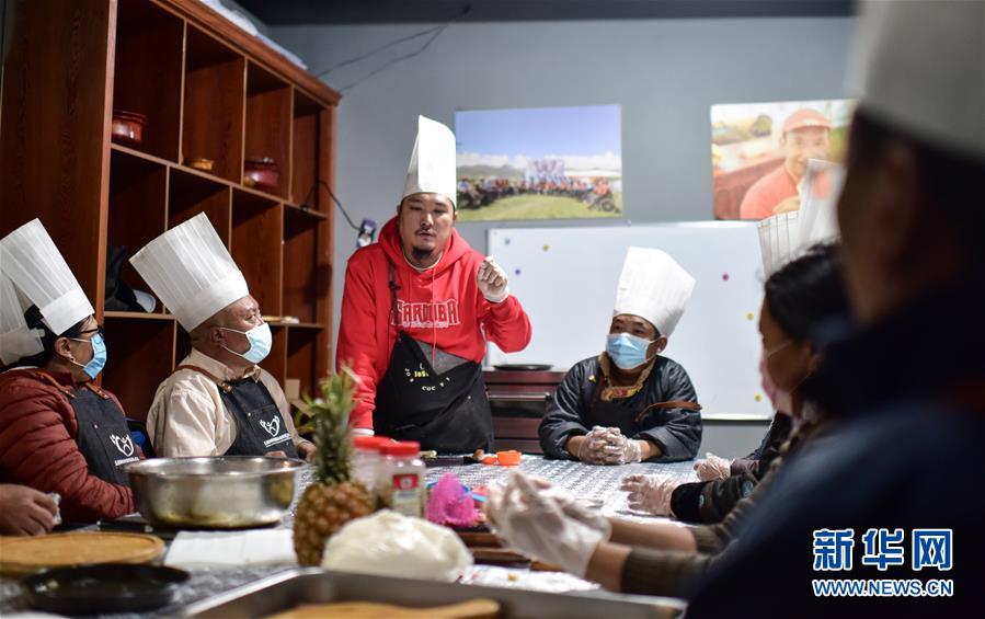 4月2日,才仁俄賽(左三)在玉樹脊髓損傷者“希望之家”做志愿者,為脊髓損傷者講解披薩制作過程。新華社記者吳剛攝