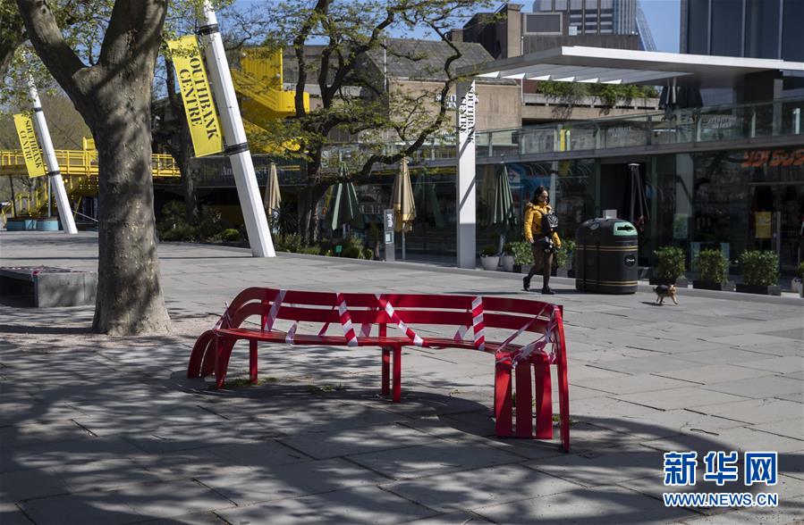 這是4月14日在英國(guó)倫敦拍攝的南岸中心前被膠帶纏住的休閑椅。新華社記者韓巖攝