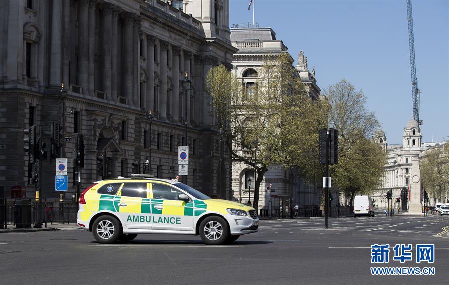 4月14日,在英國(guó)倫敦,一輛救護(hù)車(chē)從議會(huì)街前駛過(guò)。新華社記者韓巖攝