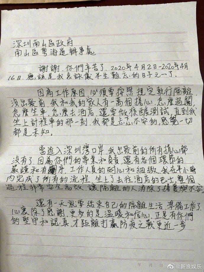 她在信中說,出發(fā)前,她和家人十分擔(dān)心,不知如何過關(guān)、坐車、去酒店,但進(jìn)入深圳灣口岸后,她所有的擔(dān)心都沒有了,因為有了大家的專業(yè)和負(fù)責(zé),各個環(huán)節(jié)的嚴(yán)謹(jǐn)和有序,工作人員的耐心和細(xì)致,她在半小時內(nèi)就完成所有流程,坐上了去酒店的巴士。信里,袁詠儀對政府工作人員表示了感謝,“就像星星,我無法始終看見他們,但是我知道他們永遠(yuǎn)在那里?!?/p>