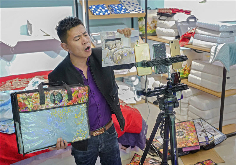 直播中的劉老板正在展示新款床單。