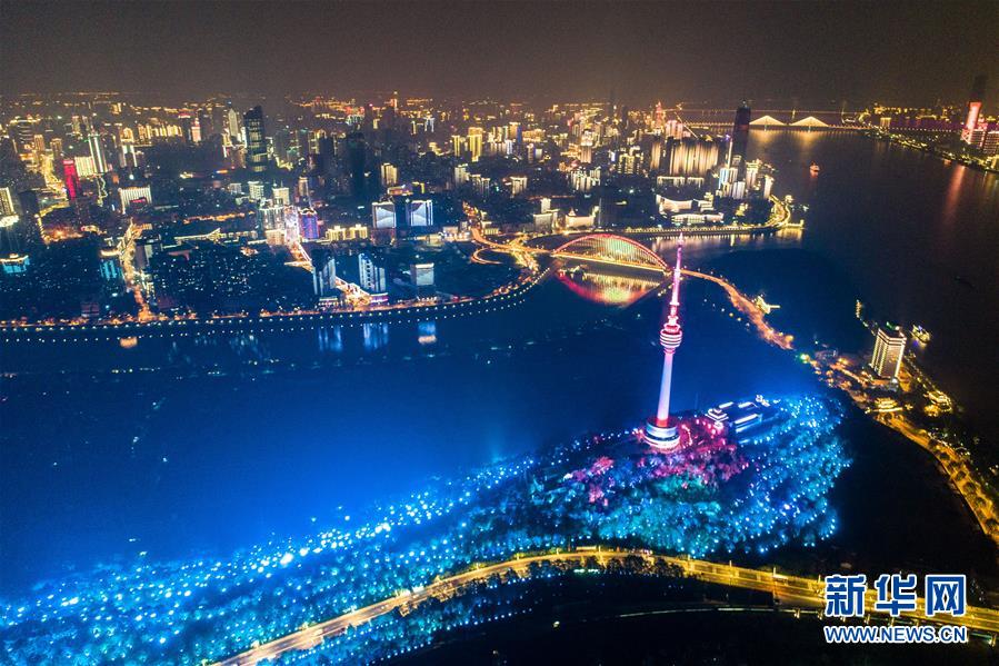 這是4月7日晚在武漢龜山拍攝的夜景(無人機照片)。新華社記者肖藝九攝