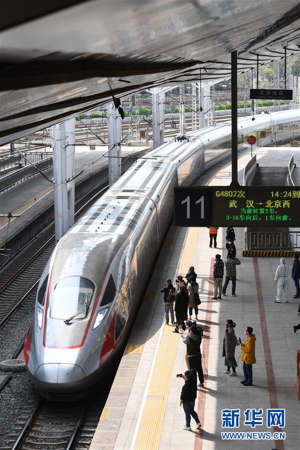 4月8日,G4802次列車駛?cè)氡本┪髡尽.?dāng)日,武漢市正式解除離漢離鄂通道管控措施,首趟武漢返京列車G4802次列車抵達(dá)北京西站。新華社記者鞠煥宗攝