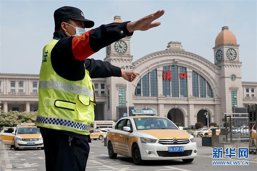 4月8日,管理人員在漢口火車站前指揮出租汽車入位。新華社記者王毓國(guó)攝