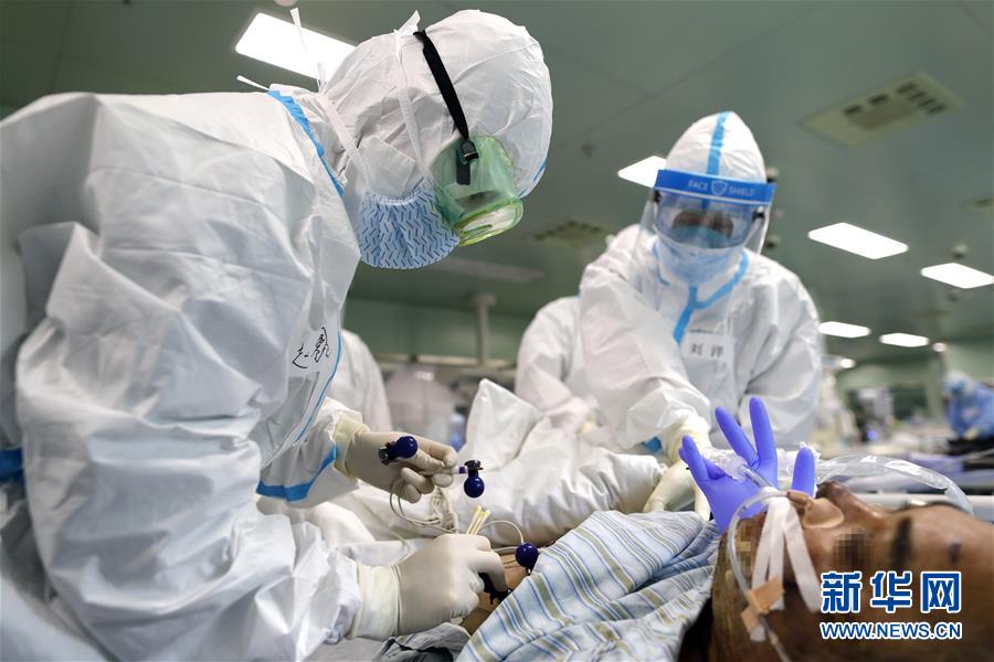4月24日,在位于武漢的華中科技大學同濟醫(yī)學院附屬協(xié)和醫(yī)院西院,醫(yī)務人員趙鑫(左)在為一名核酸檢測結(jié)果轉(zhuǎn)陰的新冠肺炎病人做檢查。新華社記者沈伯韓攝