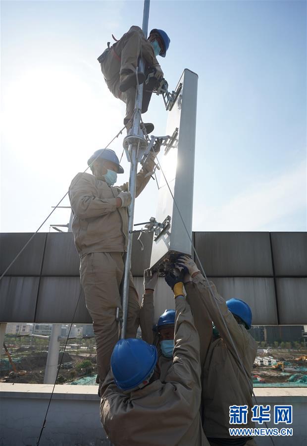 4月25日,在南京220千伏城南河變電站屋頂,工人在架設(shè)5G設(shè)備。當日,三大通信運營商的2座5G、3座4G基站建設(shè)工作在南京220千伏城南河變電站屋頂有序展開。在變電站內(nèi)建設(shè)基站可有效利用電網(wǎng)資源,縮短建設(shè)周期,節(jié)約建設(shè)成本。新華社記者季春鵬攝