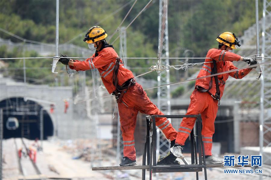 4月25日,在福建省寧德市屏南車站,施工人員開展接觸網(wǎng)調整作業(yè)。中鐵電氣化局集團上海公司推動衢寧鐵路福建段通信工程、信號工程、電力工程、電氣化工程各環(huán)節(jié)協(xié)同復工復產,目前來自河北、河南、四川等國內10個省的900多名員工返崗就業(yè)。衢寧鐵路北起浙江省衢州市,南至福建省寧德市,全長379.2公里。新華社記者彭張青攝