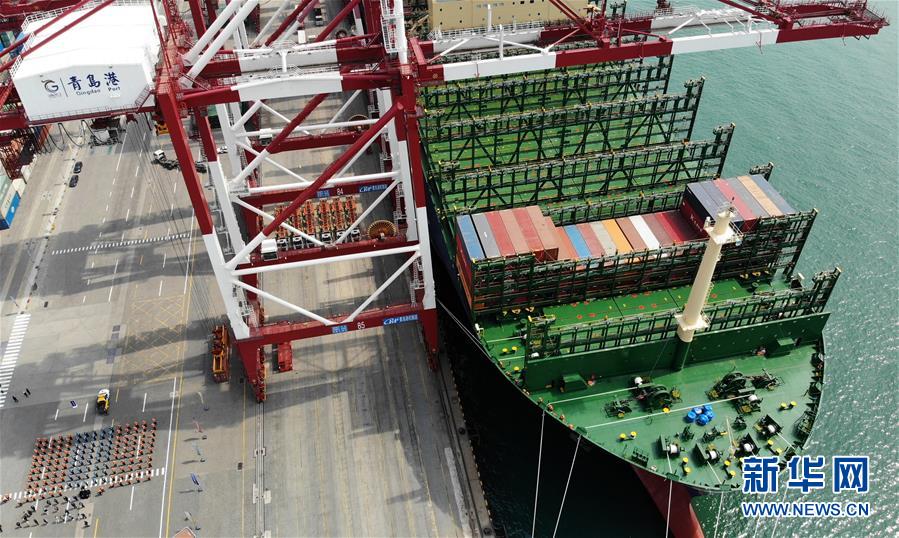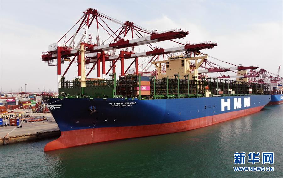 “現(xiàn)代商船阿爾赫西拉斯”輪靠泊在青島港前灣碼頭(無人機(jī)照片,4月26日攝)。當(dāng)日,載箱量可達(dá)2.4萬標(biāo)準(zhǔn)箱的世界最大集裝箱船“現(xiàn)代商船阿爾赫西拉斯”輪從山東青島港開啟首航,這條船的甲板面積超過2.4萬平方米,相當(dāng)于3.5個標(biāo)準(zhǔn)足球場大小。新華社記者李紫恒攝