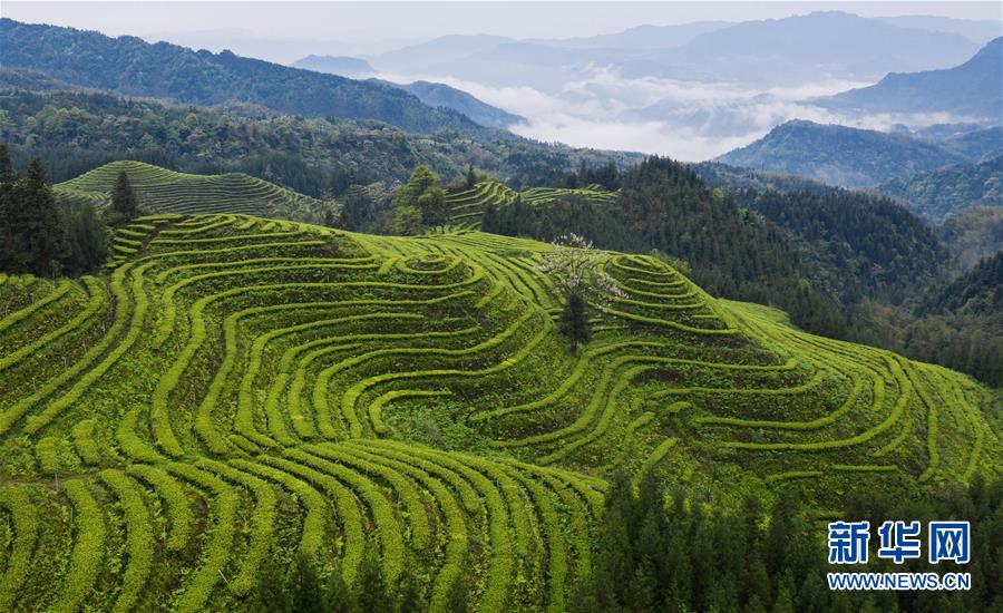 俯瞰鹿鳴茶海一角(4月28日無(wú)人機(jī)照片)。四川省珙縣的鹿鳴茶海,常年云霧繚繞,茶壟依山分布,美不勝收。新華社記者江宏景攝