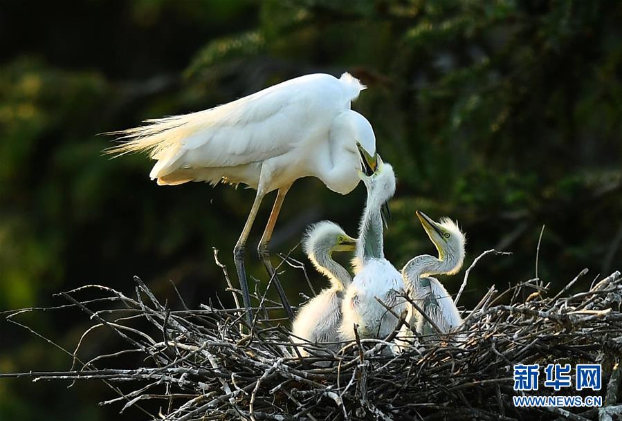 在南昌市新建區(qū)象山森林公園內(nèi),一只白鷺在鳥巢內(nèi)給幼鳥喂食(4月27日攝)。近日,在江西省南昌市新建區(qū)象山森林公園內(nèi),已安家筑巢的大批白鷺進入繁殖旺季。在夕陽的照耀下,白鷺時而翩翩起舞,時而展翅盤旋,構(gòu)成一幅美麗的自然生態(tài)畫卷。新華社記者萬象攝