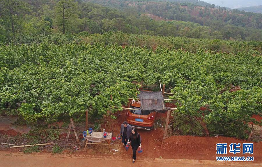 4月28日,游客從云南省富民縣赤鷲鎮(zhèn)普橋村櫻桃園走出(無(wú)人機(jī)照片)。云南省富民縣赤鷲鎮(zhèn)大力發(fā)展特色種植業(yè),全鎮(zhèn)種植櫻桃4000余畝,幫助當(dāng)?shù)剞r(nóng)民增收致富。新華社記者楊宗友攝