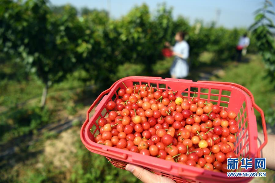 5月3日,游客在豐樂鎮(zhèn)鳳嶺苗木種植扶貧產(chǎn)業(yè)園里體驗(yàn)采摘櫻桃。新華社記者劉軍喜攝