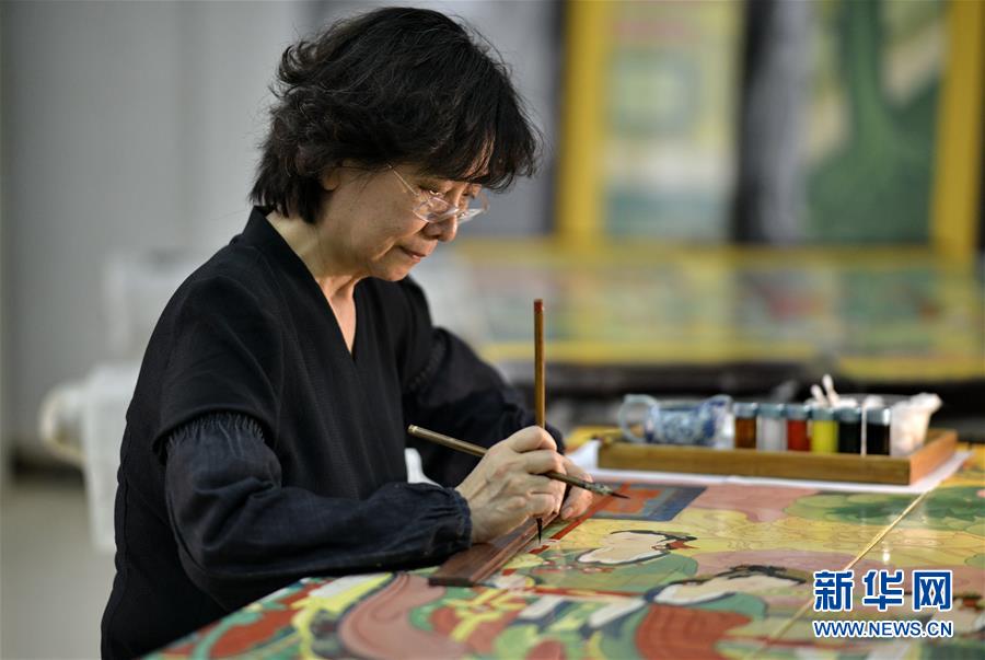 5月4日,工藝美術(shù)大師胡昕在進(jìn)行屏風(fēng)畫面最后的檢視修補。