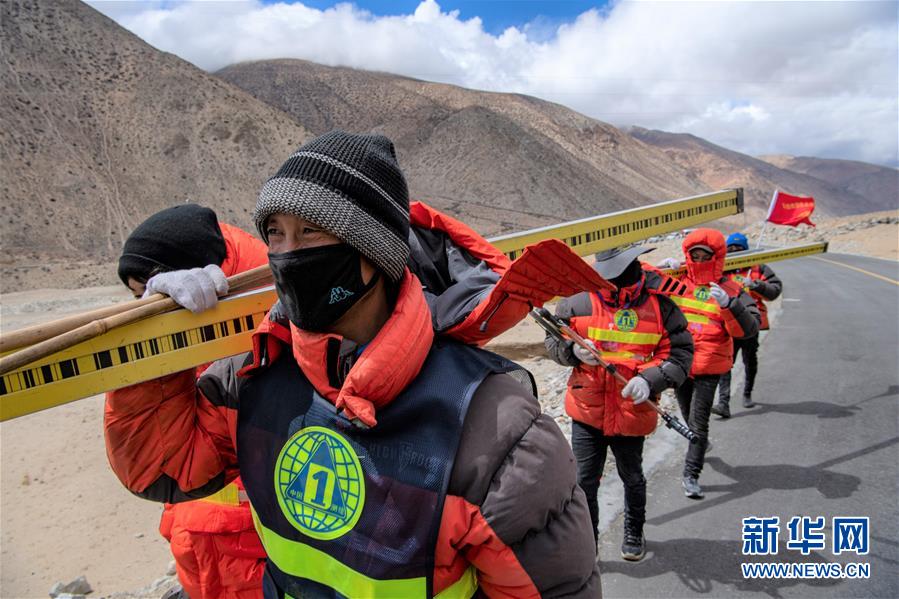 在西藏定日縣曲當鄉(xiāng)境內(nèi),國測一大隊隊員前往水準測量點(4月18日攝)。水準測量是一種利用提供水平視線的儀器(如水準儀、水準標尺),測定地面不同點之間的高差,并以此推算高度的一種方法,是經(jīng)典大地測量的重要技術(shù)之一。在目前正在進行的2020珠峰高程測量中,部分國測一大隊隊員承擔了水準測量的任務。新華社記者孫非攝