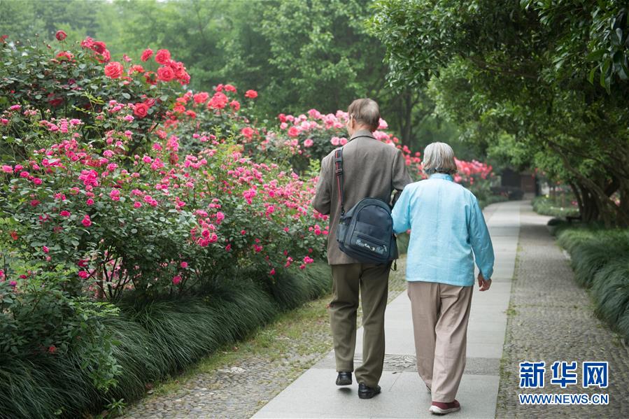 5月5日,游客在西湖畔的郭莊和月季合影。“五一”期間,第八屆杭州西湖月季花精品展在杭州西子湖畔舉行,展出國內(nèi)外700余個(gè)月季品種。新華社記者翁忻旸攝