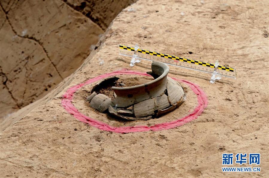 這是4月28日拍攝的雙槐樹(shù)遺址內(nèi)用陶罐模擬的北斗九星天文遺跡。新華社記者李安攝