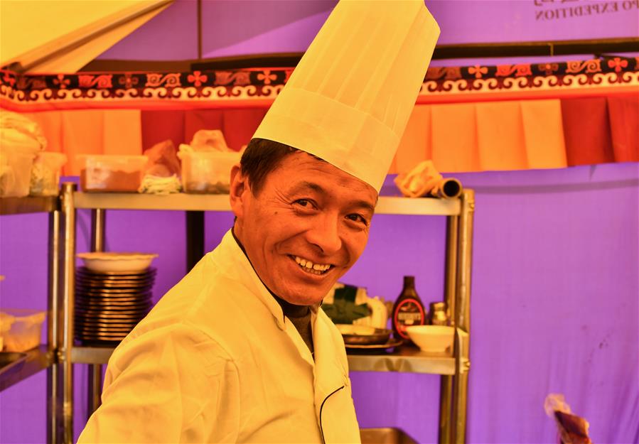 高山廚師赤列在珠峰大本營(yíng)(5月8日攝)。5月8日是世界微笑日。在海拔5200米的珠峰大本營(yíng),參與2020珠峰高程測(cè)量的各方人員,微笑期待本次測(cè)量活動(dòng)的圓滿成功。