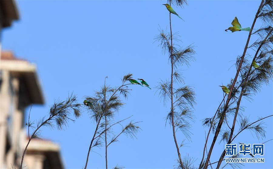 在海口五源河下游蜂虎保護小區(qū),栗喉蜂虎在嬉戲(5月7日攝)。新華社記者楊冠宇攝