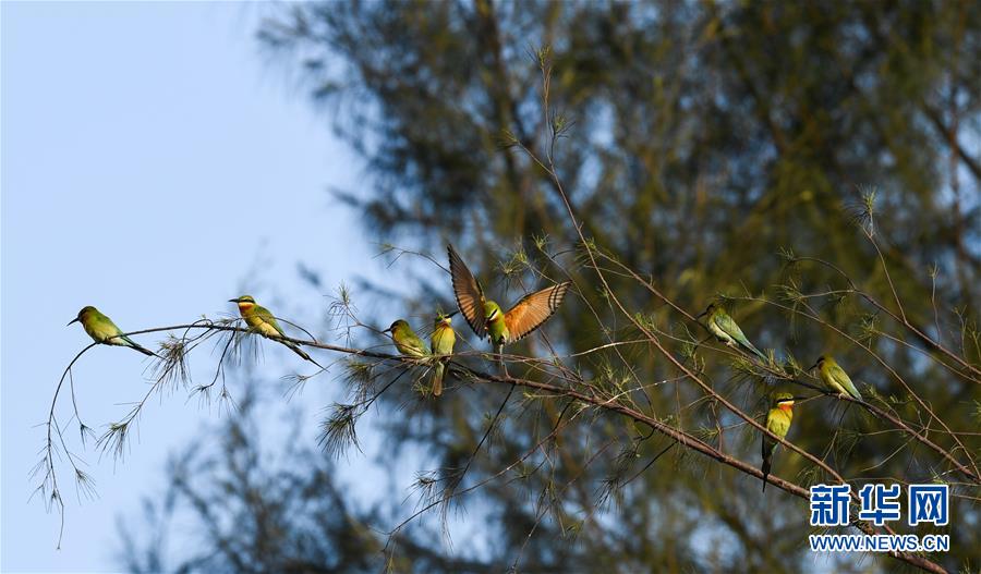 近日,百余只栗喉蜂虎和少量藍喉蜂虎來到海南省海口市西海岸多個地點棲息繁衍,為椰城增添一抹亮色。據(jù)了解,蜂虎每年春夏都會回到固定地點繁殖,由于習(xí)性特殊,蜂虎需要在新形成的沙質(zhì)土坡上做窩。為此,??谑邢嚓P(guān)部門每年在蜂虎到來之前,會在蜂虎棲息地整坡清樹,為蜂虎營造良好的棲息環(huán)境。