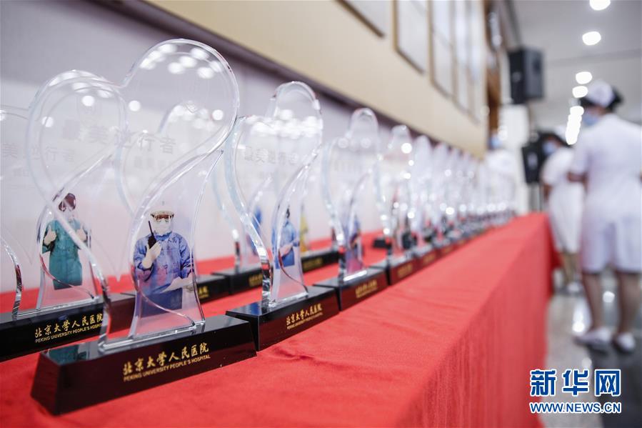 5月11日,工作人員整理印有援鄂隊(duì)員工作照的獎(jiǎng)杯。在國際護(hù)士節(jié)到來之際,北京大學(xué)人民醫(yī)院11日舉辦慶祝護(hù)士節(jié)暨優(yōu)秀集體和個(gè)人表彰活動(dòng),并邀請(qǐng)?jiān)踽t(yī)療隊(duì)護(hù)士代表分享戰(zhàn)“疫”故事。我國今年護(hù)士節(jié)的主題為“致敬護(hù)士隊(duì)伍,攜手戰(zhàn)勝疫情”。新華社記者張玉薇攝
