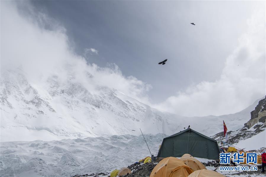 在海拔6500米的珠峰前進營地,幾只黃嘴山鴉在空中飛翔(5月10日攝)。新華社記者孫非攝
