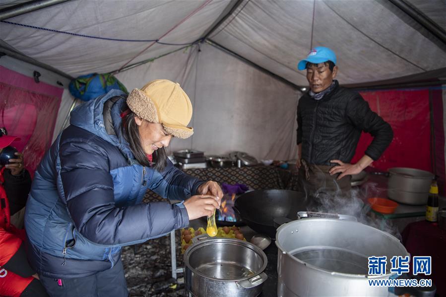 在海拔6500米的前進(jìn)營(yíng)地,高山廚師在準(zhǔn)備菜品(5月10日攝)。新華社記者孫非攝